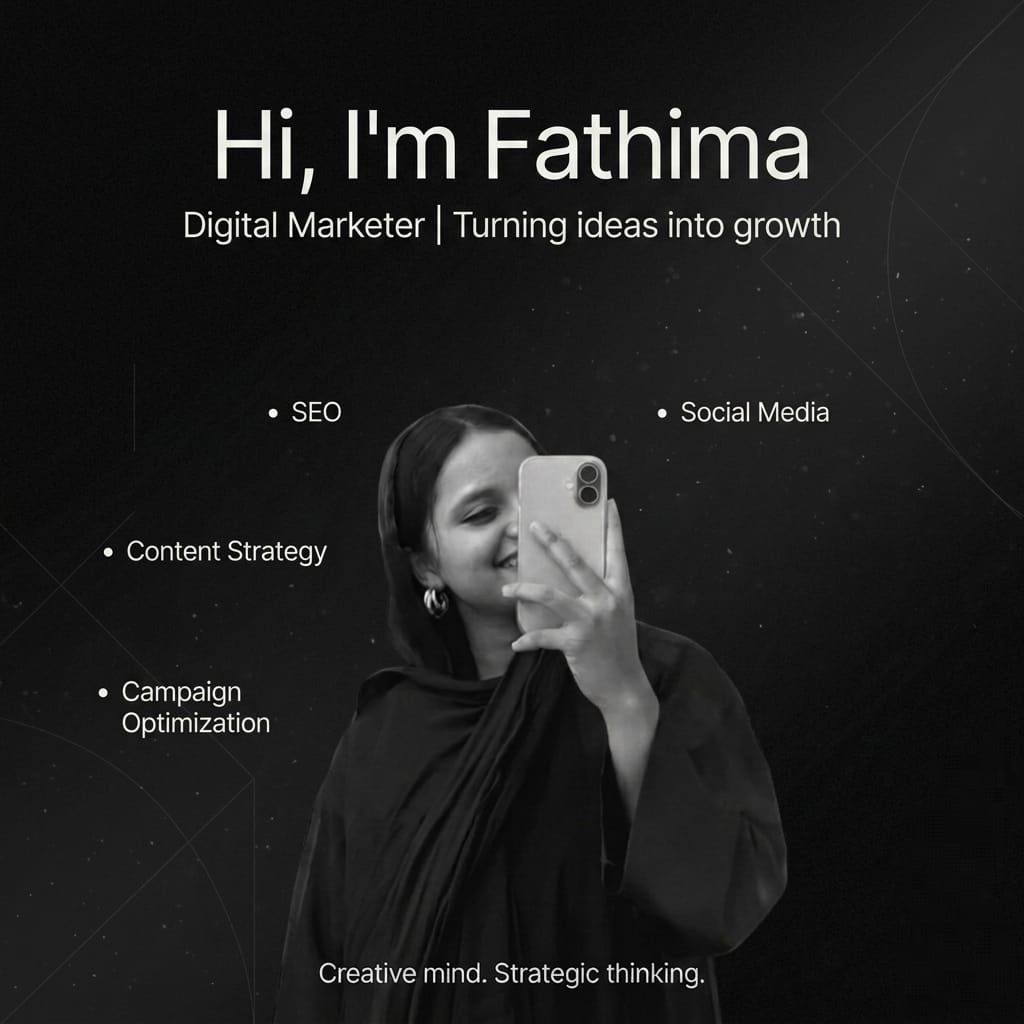 Hi I’m Fathima Shihabudheen, a Thrissur-based freelance digital marketing expert in Thrissur with a degree in English Language & Literature. I specialise in crafting clear-cut strategies for small businesses: SEO, social media marketing, lead generation, ad-campaign setup, email marketing and web development.
